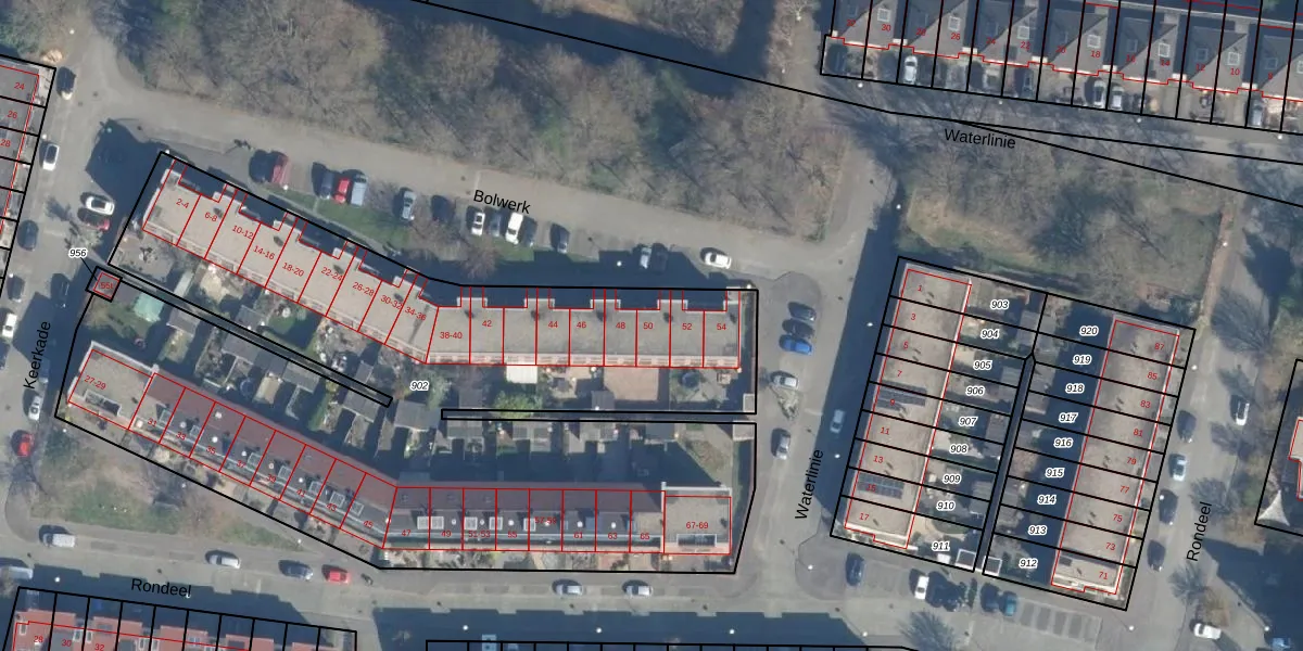 Het perceel waarop Bolwerk 50 staat heeft een oppervlakte van 4421 m². Dit is een zeer groot perceel. De perceeloppervlakte wordt geregistreerd door het Kadaster. Gedetailleerde informatie over de maten van dit perceel kunt u vinden in het rapport Kadastrale kaart met maatvoering van Bolwerk 50.