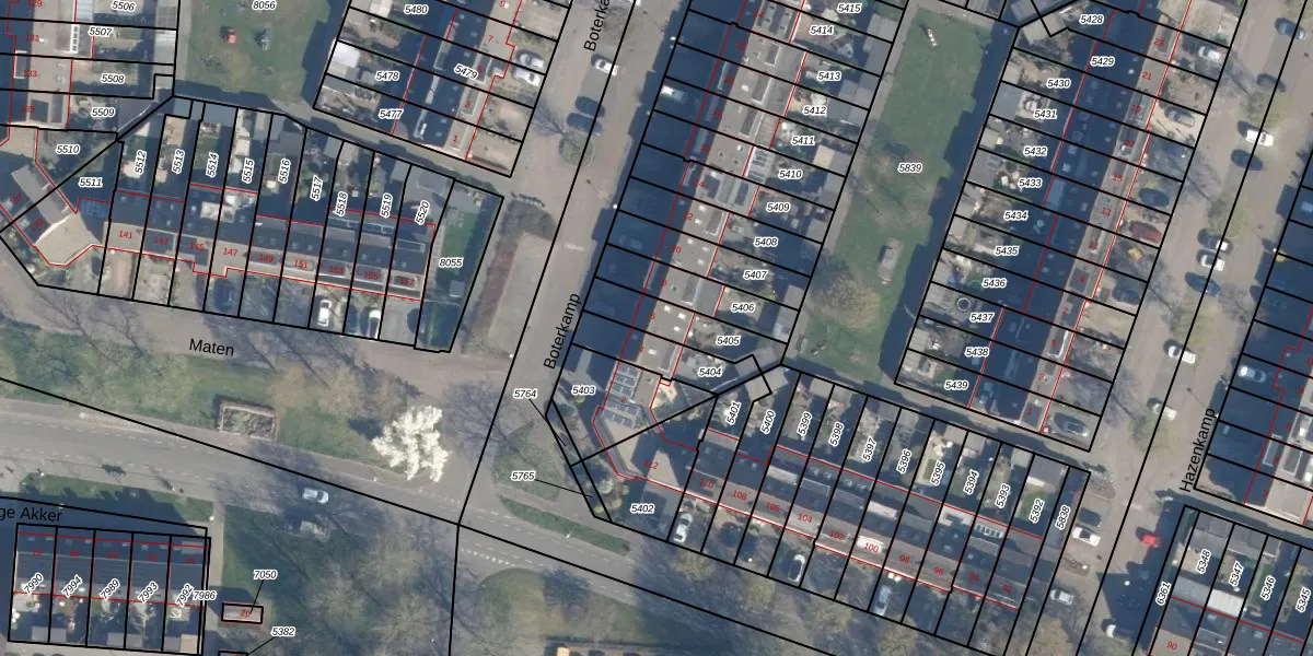 Het perceel waarop Boterkamp 6 staat heeft een oppervlakte van 163 m². Dit is een middelgroot perceel. De perceeloppervlakte wordt geregistreerd door het Kadaster. Gedetailleerde informatie over de maten van dit perceel kunt u vinden in het rapport Kadastrale kaart met maatvoering van Boterkamp 6.