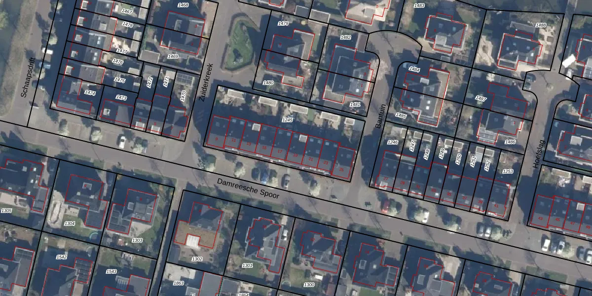 Het perceel waarop Damreesche Spoor 19 staat heeft een oppervlakte van 1088 m². Dit is een zeer groot perceel. De perceeloppervlakte wordt geregistreerd door het Kadaster. Gedetailleerde informatie over de maten van dit perceel kunt u vinden in het rapport Kadastrale kaart met maatvoering van Damreesche Spoor 19.