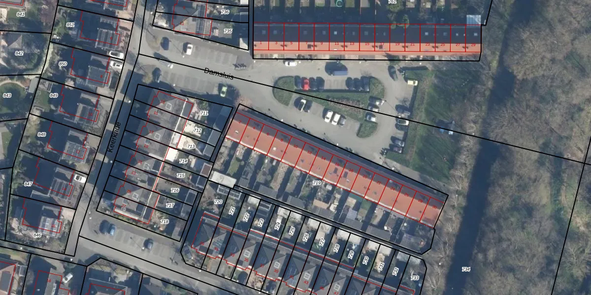 Het perceel waarop Damsluis 10 staat heeft een oppervlakte van 1889 m². Dit is een zeer groot perceel. De perceeloppervlakte wordt geregistreerd door het Kadaster. Gedetailleerde informatie over de maten van dit perceel kunt u vinden in het rapport Kadastrale kaart met maatvoering van Damsluis 10.