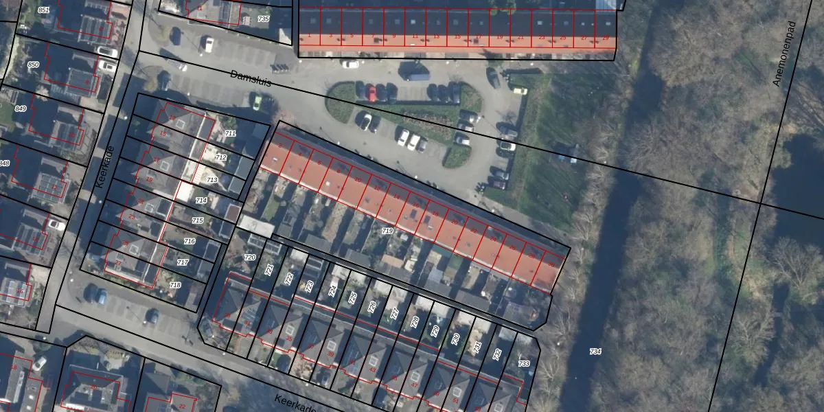 Het perceel waarop Damsluis 16 staat heeft een oppervlakte van 1889 m². Dit is een zeer groot perceel. De perceeloppervlakte wordt geregistreerd door het Kadaster. Gedetailleerde informatie over de maten van dit perceel kunt u vinden in het rapport Kadastrale kaart met maatvoering van Damsluis 16.