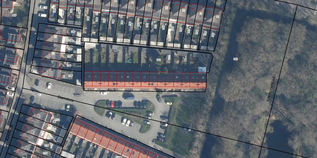 Het perceel waarop Damsluis 19 staat heeft een oppervlakte van 2185 m². Dit is een zeer groot perceel. De perceeloppervlakte wordt geregistreerd door het Kadaster. Gedetailleerde informatie over de maten van dit perceel kunt u vinden in het rapport Kadastrale kaart met maatvoering van Damsluis 19.