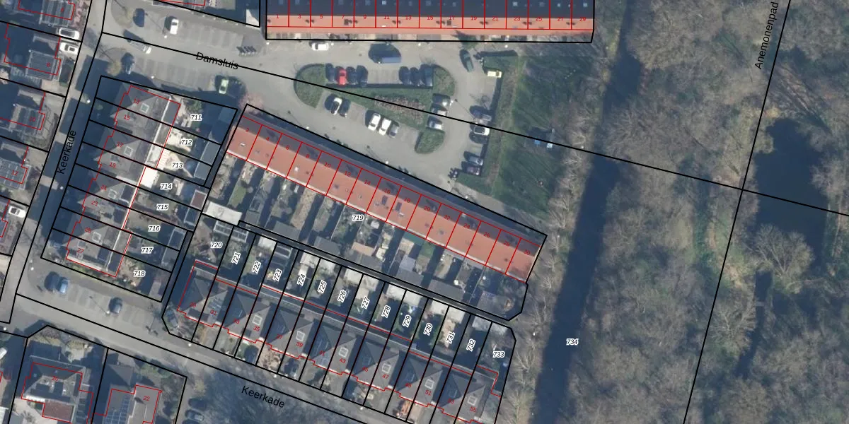 Het perceel waarop Damsluis 20 staat heeft een oppervlakte van 1889 m². Dit is een zeer groot perceel. De perceeloppervlakte wordt geregistreerd door het Kadaster. Gedetailleerde informatie over de maten van dit perceel kunt u vinden in het rapport Kadastrale kaart met maatvoering van Damsluis 20.