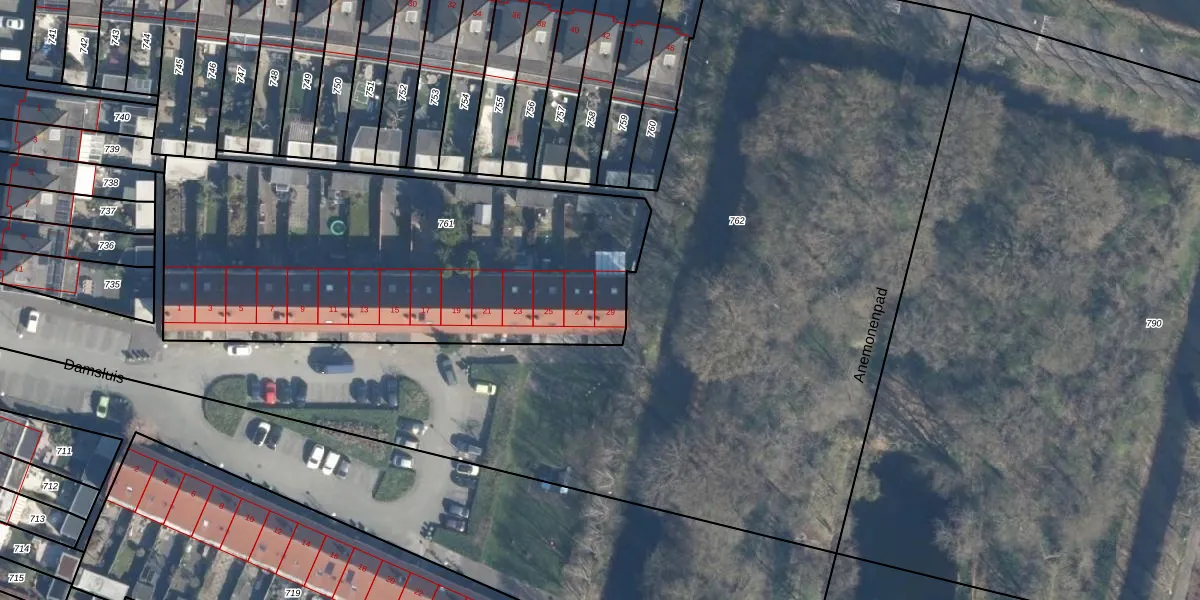 Het perceel waarop Damsluis 29 staat heeft een oppervlakte van 2185 m². Dit is een zeer groot perceel. De perceeloppervlakte wordt geregistreerd door het Kadaster. Gedetailleerde informatie over de maten van dit perceel kunt u vinden in het rapport Kadastrale kaart met maatvoering van Damsluis 29.