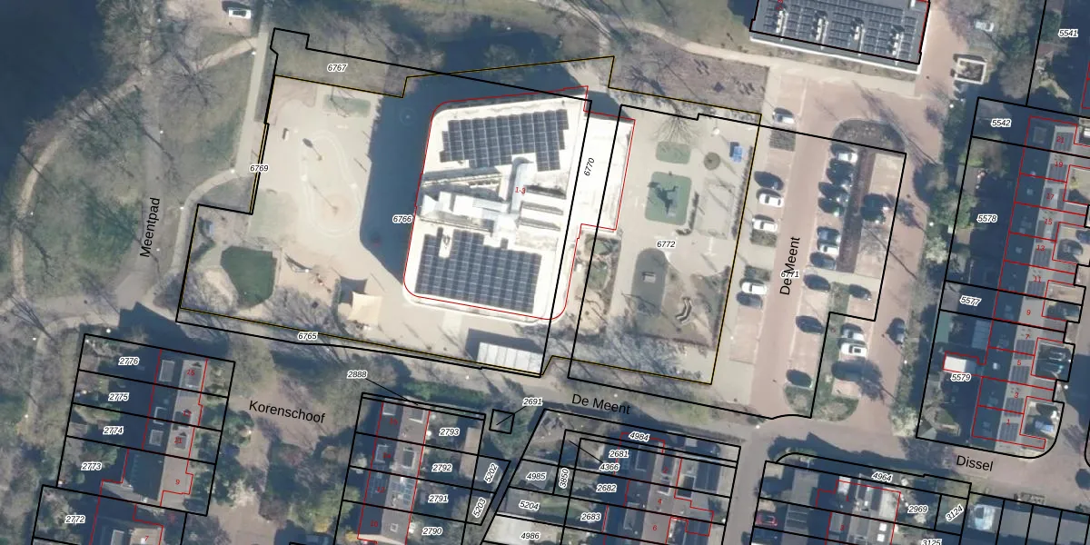 Het perceel waarop De Meent 1 staat heeft een oppervlakte van 2986 m². Dit is een zeer groot perceel. De perceeloppervlakte wordt geregistreerd door het Kadaster. Gedetailleerde informatie over de maten van dit perceel kunt u vinden in het rapport Kadastrale kaart met maatvoering van De Meent 1.