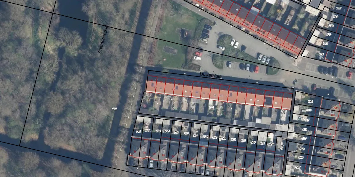 Het perceel waarop Duikersluis 25 staat heeft een oppervlakte van 2061 m². Dit is een zeer groot perceel. De perceeloppervlakte wordt geregistreerd door het Kadaster. Gedetailleerde informatie over de maten van dit perceel kunt u vinden in het rapport Kadastrale kaart met maatvoering van Duikersluis 25.