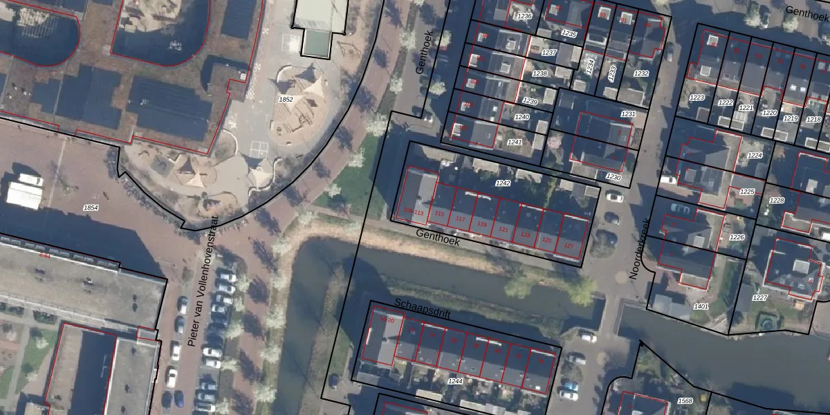 Het perceel waarop Genthoek 113 staat heeft een oppervlakte van 937 m². Dit is een groot perceel. De perceeloppervlakte wordt geregistreerd door het Kadaster. Gedetailleerde informatie over de maten van dit perceel kunt u vinden in het rapport Kadastrale kaart met maatvoering van Genthoek 113.