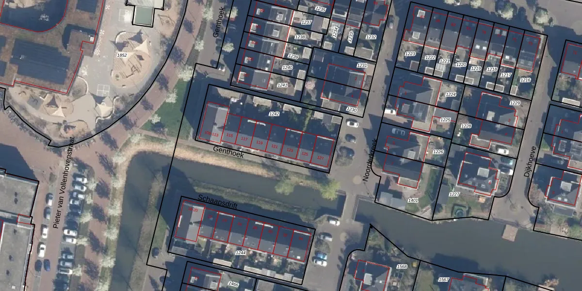 Het perceel waarop Genthoek 123 staat heeft een oppervlakte van 937 m². Dit is een groot perceel. De perceeloppervlakte wordt geregistreerd door het Kadaster. Gedetailleerde informatie over de maten van dit perceel kunt u vinden in het rapport Kadastrale kaart met maatvoering van Genthoek 123.