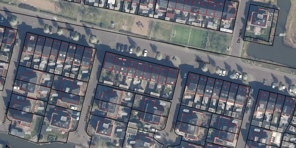 Het perceel waarop Genthoek 61 staat heeft een oppervlakte van 1088 m². Dit is een zeer groot perceel. De perceeloppervlakte wordt geregistreerd door het Kadaster. Gedetailleerde informatie over de maten van dit perceel kunt u vinden in het rapport Kadastrale kaart met maatvoering van Genthoek 61.
