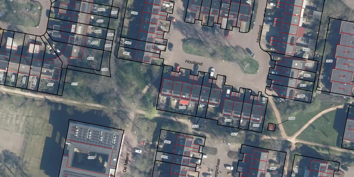 Het perceel waarop Hooiland 19 staat heeft een oppervlakte van 556 m². Dit is een groot perceel. De perceeloppervlakte wordt geregistreerd door het Kadaster. Gedetailleerde informatie over de maten van dit perceel kunt u vinden in het rapport Kadastrale kaart met maatvoering van Hooiland 19.