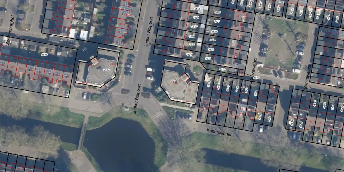 Het perceel waarop Jonker Bolpoort 23 staat heeft een oppervlakte van 383 m². Dit is een groot perceel. De perceeloppervlakte wordt geregistreerd door het Kadaster. Gedetailleerde informatie over de maten van dit perceel kunt u vinden in het rapport Kadastrale kaart met maatvoering van Jonker Bolpoort 23.