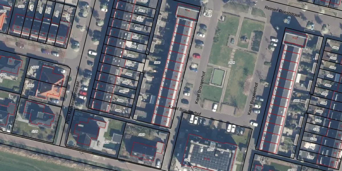 Het perceel waarop Karel Brouwerhof 16 staat heeft een oppervlakte van 1690 m². Dit is een zeer groot perceel. De perceeloppervlakte wordt geregistreerd door het Kadaster. Gedetailleerde informatie over de maten van dit perceel kunt u vinden in het rapport Kadastrale kaart met maatvoering van Karel Brouwerhof 16.