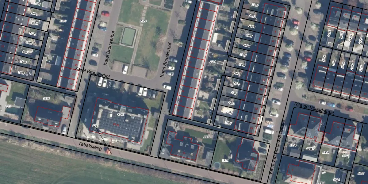 Het perceel waarop Karel Brouwerhof 19 staat heeft een oppervlakte van 1690 m². Dit is een zeer groot perceel. De perceeloppervlakte wordt geregistreerd door het Kadaster. Gedetailleerde informatie over de maten van dit perceel kunt u vinden in het rapport Kadastrale kaart met maatvoering van Karel Brouwerhof 19.