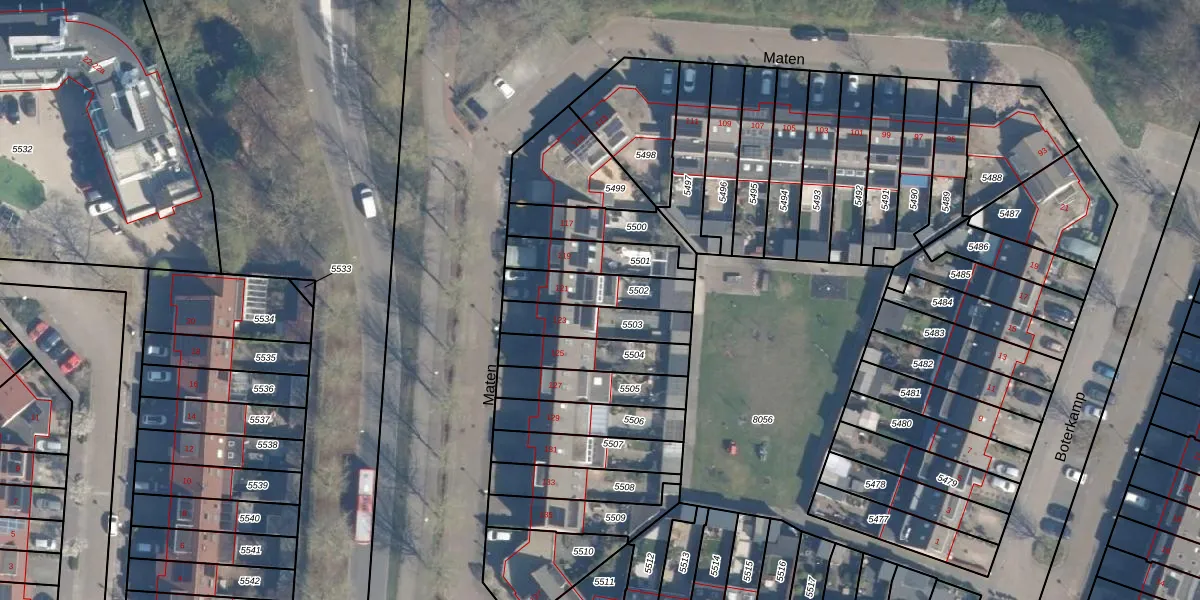 Het perceel waarop Maten 121 staat heeft een oppervlakte van 172 m². Dit is een middelgroot perceel. De perceeloppervlakte wordt geregistreerd door het Kadaster. Gedetailleerde informatie over de maten van dit perceel kunt u vinden in het rapport Kadastrale kaart met maatvoering van Maten 121.