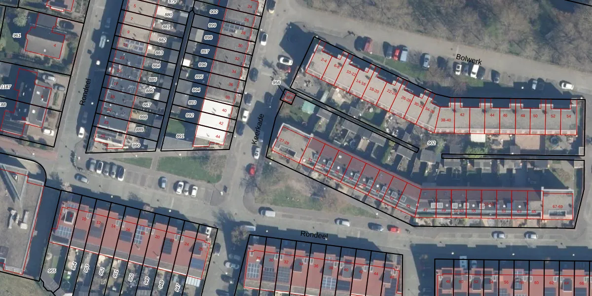 Het perceel waarop Rondeel 29 staat heeft een oppervlakte van 4421 m². Dit is een zeer groot perceel. De perceeloppervlakte wordt geregistreerd door het Kadaster. Gedetailleerde informatie over de maten van dit perceel kunt u vinden in het rapport Kadastrale kaart met maatvoering van Rondeel 29.