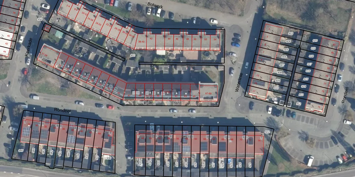 Het perceel waarop Rondeel 61 staat heeft een oppervlakte van 4421 m². Dit is een zeer groot perceel. De perceeloppervlakte wordt geregistreerd door het Kadaster. Gedetailleerde informatie over de maten van dit perceel kunt u vinden in het rapport Kadastrale kaart met maatvoering van Rondeel 61.