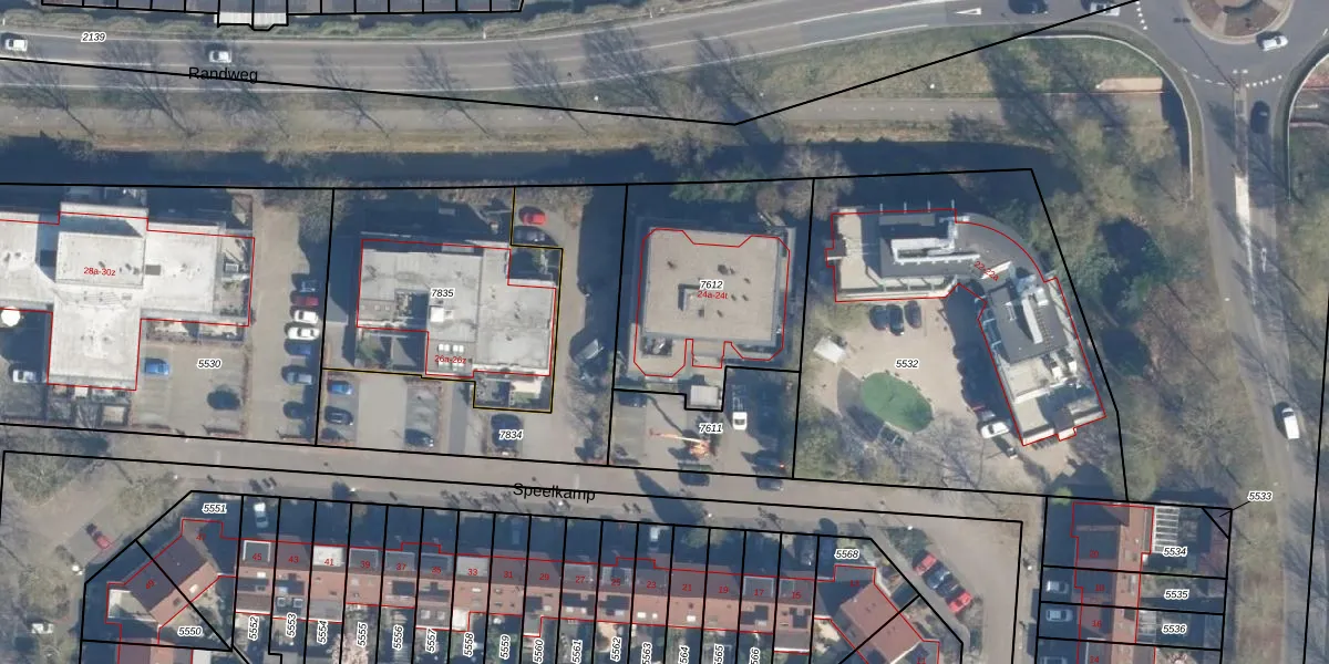 Het perceel waarop Speelkamp 24-f staat heeft een oppervlakte van 865 m². Dit is een groot perceel. De perceeloppervlakte wordt geregistreerd door het Kadaster. Gedetailleerde informatie over de maten van dit perceel kunt u vinden in het rapport Kadastrale kaart met maatvoering van Speelkamp 24-f.