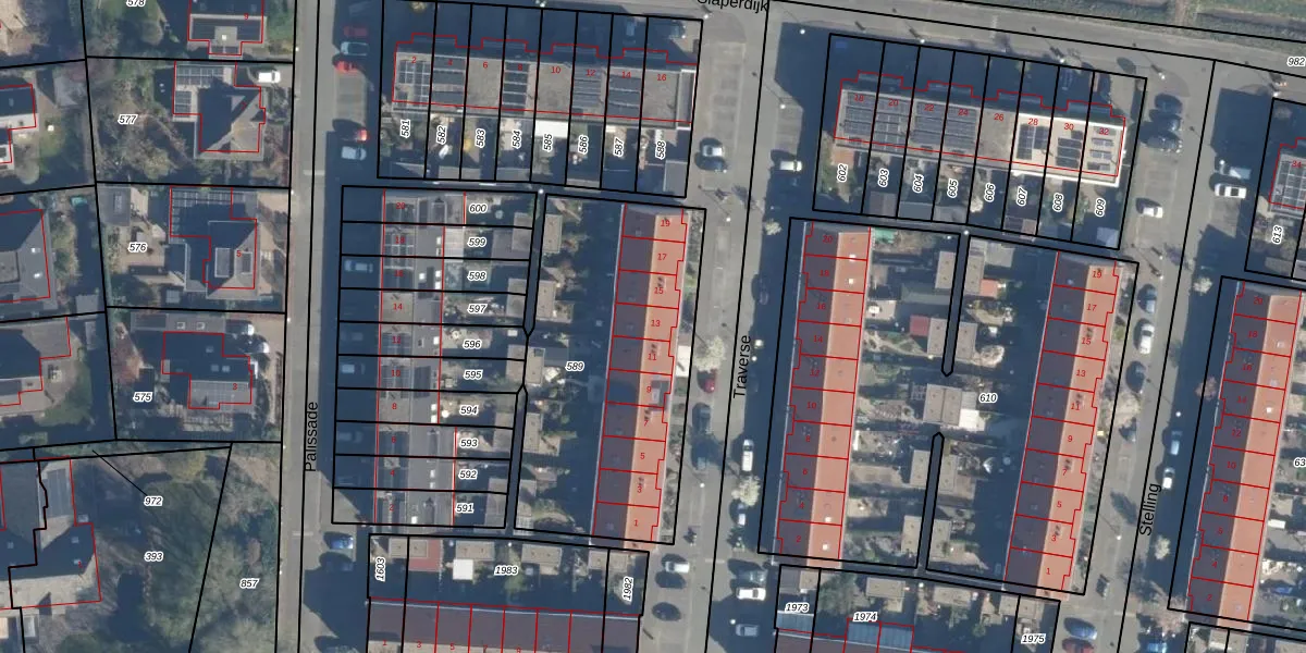 Het perceel waarop Traverse 13 staat heeft een oppervlakte van 1269 m². Dit is een zeer groot perceel. De perceeloppervlakte wordt geregistreerd door het Kadaster. Gedetailleerde informatie over de maten van dit perceel kunt u vinden in het rapport Kadastrale kaart met maatvoering van Traverse 13.