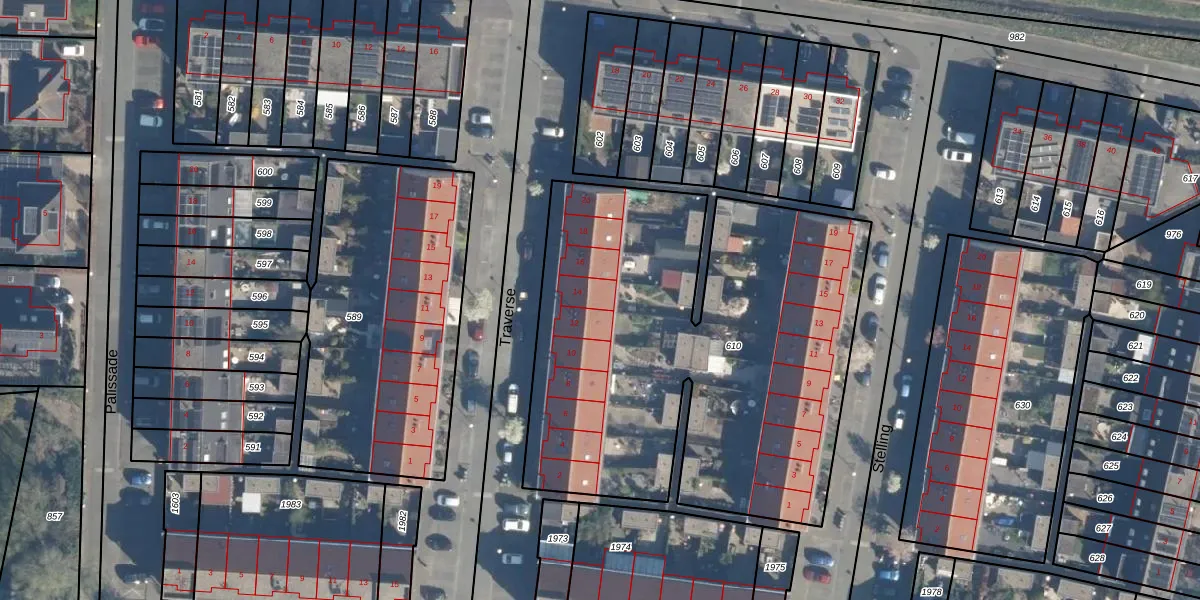 Het perceel waarop Traverse 14 staat heeft een oppervlakte van 2618 m². Dit is een zeer groot perceel. De perceeloppervlakte wordt geregistreerd door het Kadaster. Gedetailleerde informatie over de maten van dit perceel kunt u vinden in het rapport Kadastrale kaart met maatvoering van Traverse 14.