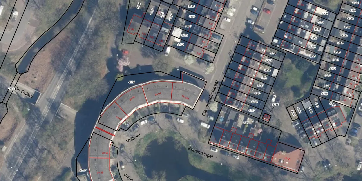Vrijhoef 100 is gelegen op kadastraal perceel LDN02E4186. Deze kadastrale aanduiding is uniek en wordt gebruikt door het Kadaster om eigendomsrechten en andere zakelijke rechten vast te leggen. Het perceel maakt onderdeel uit van de kadastrale gemeente Leusden.