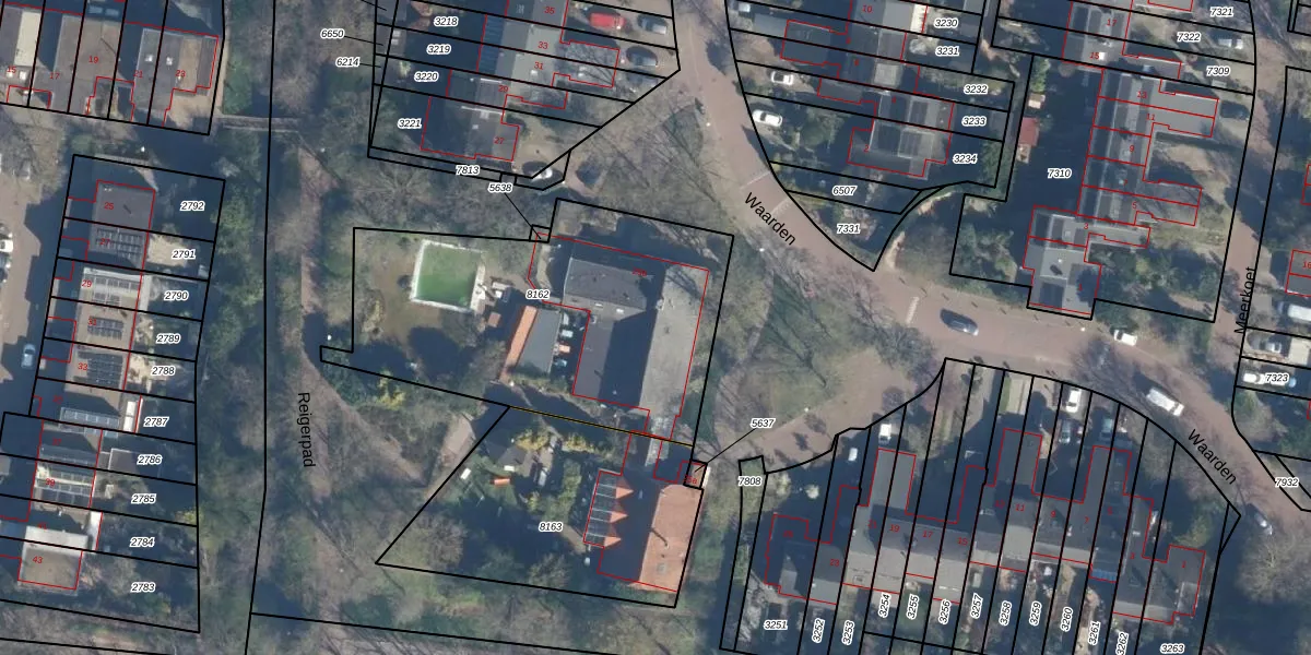 Het perceel waarop Waarden 25-b staat heeft een oppervlakte van 1556 m². Dit is een zeer groot perceel. De perceeloppervlakte wordt geregistreerd door het Kadaster. Gedetailleerde informatie over de maten van dit perceel kunt u vinden in het rapport Kadastrale kaart met maatvoering van Waarden 25-b.