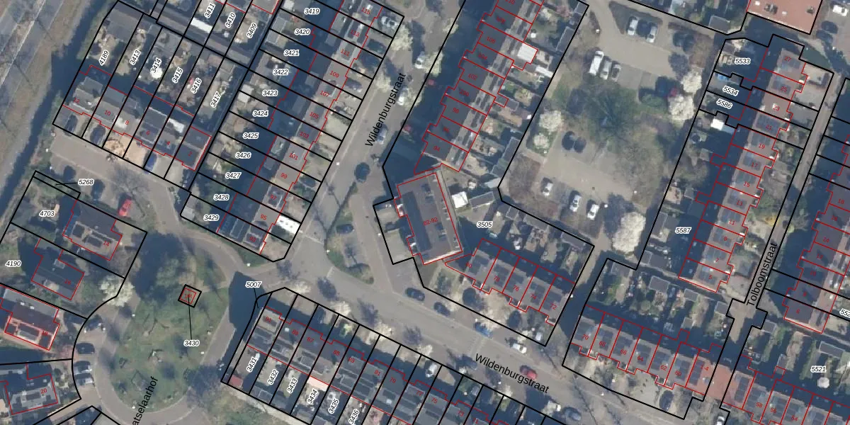 Het perceel waarop Wildenburgstraat 90 staat heeft een oppervlakte van 2580 m². Dit is een zeer groot perceel. De perceeloppervlakte wordt geregistreerd door het Kadaster. Gedetailleerde informatie over de maten van dit perceel kunt u vinden in het rapport Kadastrale kaart met maatvoering van Wildenburgstraat 90.