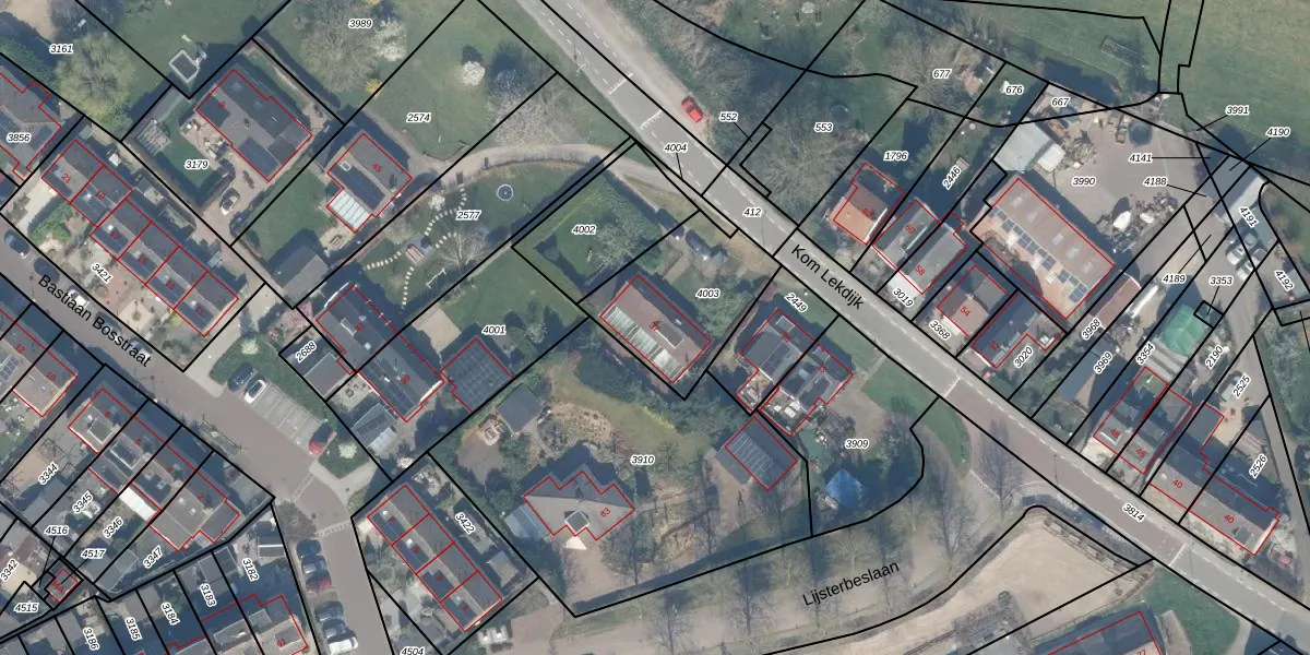 Het perceel waarop Kom Lekdijk 37 staat heeft een oppervlakte van 433 m². Dit is een groot perceel. De perceeloppervlakte wordt geregistreerd door het Kadaster. Gedetailleerde informatie over de maten van dit perceel kunt u vinden in het rapport Kadastrale kaart met maatvoering van Kom Lekdijk 37.