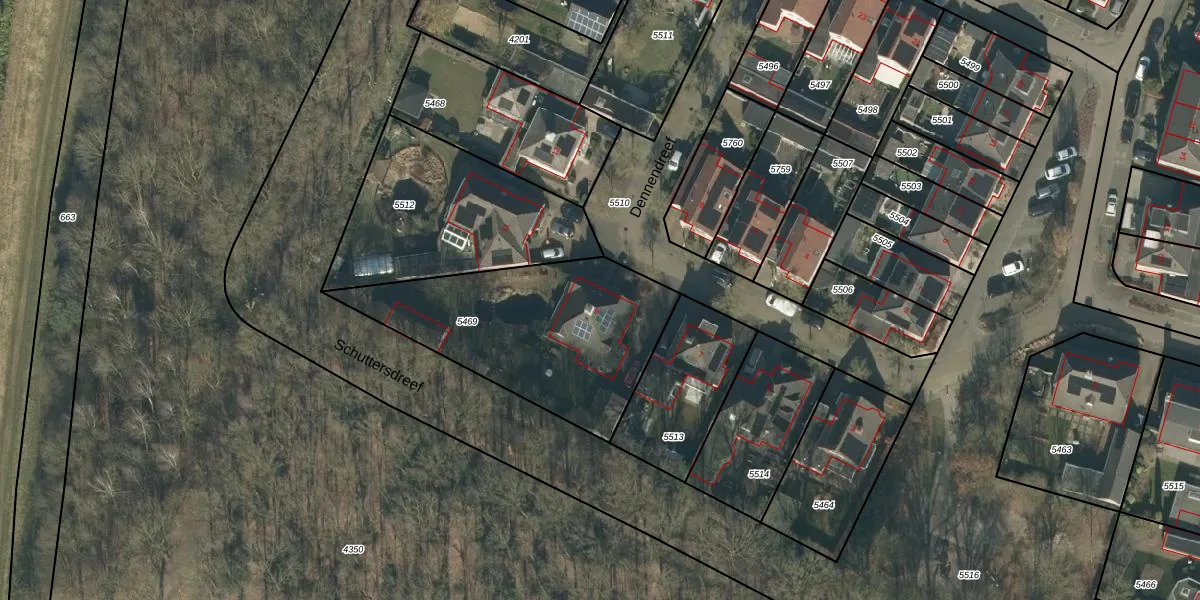 Dennendreef 9 is gelegen op kadastraal perceel LDE02E5469. Deze kadastrale aanduiding is uniek en wordt gebruikt door het Kadaster om eigendomsrechten en andere zakelijke rechten vast te leggen. Het perceel maakt onderdeel uit van de kadastrale gemeente Liempde.