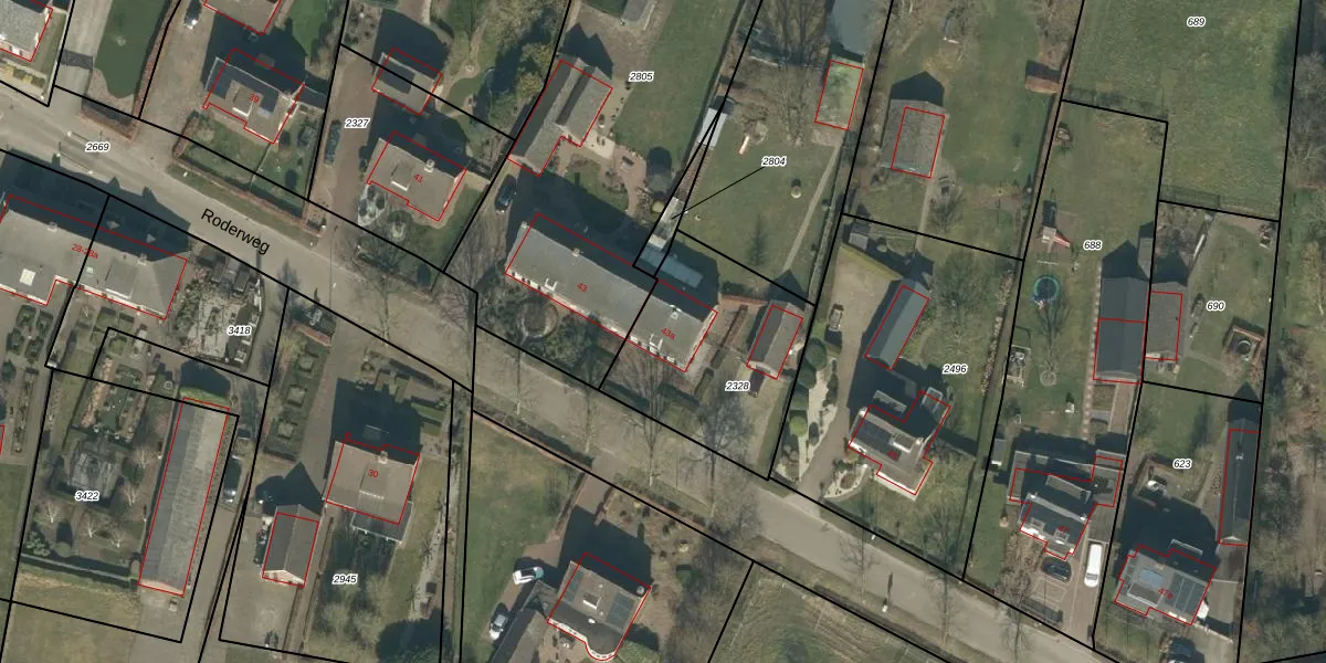 Roderweg 43-a is gelegen op kadastraal perceel LDE02B2328. Deze kadastrale aanduiding is uniek en wordt gebruikt door het Kadaster om eigendomsrechten en andere zakelijke rechten vast te leggen. Het perceel maakt onderdeel uit van de kadastrale gemeente Liempde.