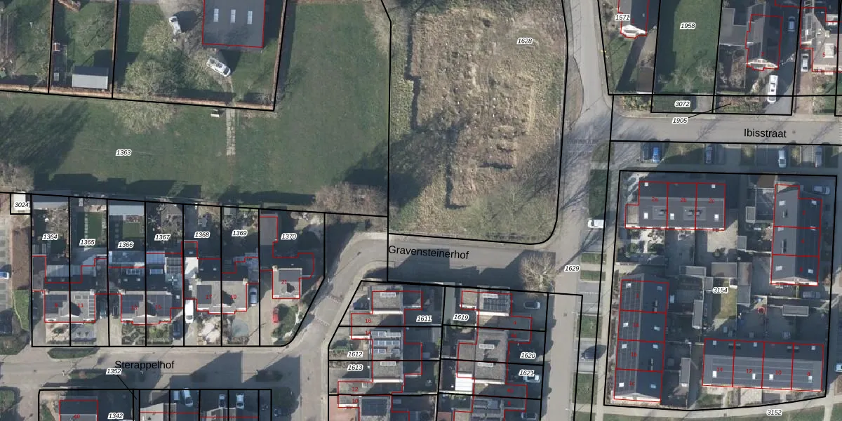 Het perceel waarop Gravensteinerhof 23 staat heeft een oppervlakte van 2416 m². Dit is een zeer groot perceel. De perceeloppervlakte wordt geregistreerd door het Kadaster. Gedetailleerde informatie over de maten van dit perceel kunt u vinden in het rapport Kadastrale kaart met maatvoering van Gravensteinerhof 23.