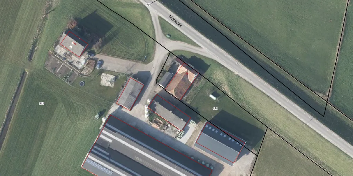 Het perceel waarop Marsdijk 24 staat heeft een oppervlakte van 1275 m². Dit is een zeer groot perceel. De perceeloppervlakte wordt geregistreerd door het Kadaster. Gedetailleerde informatie over de maten van dit perceel kunt u vinden in het rapport Kadastrale kaart met maatvoering van Marsdijk 24.