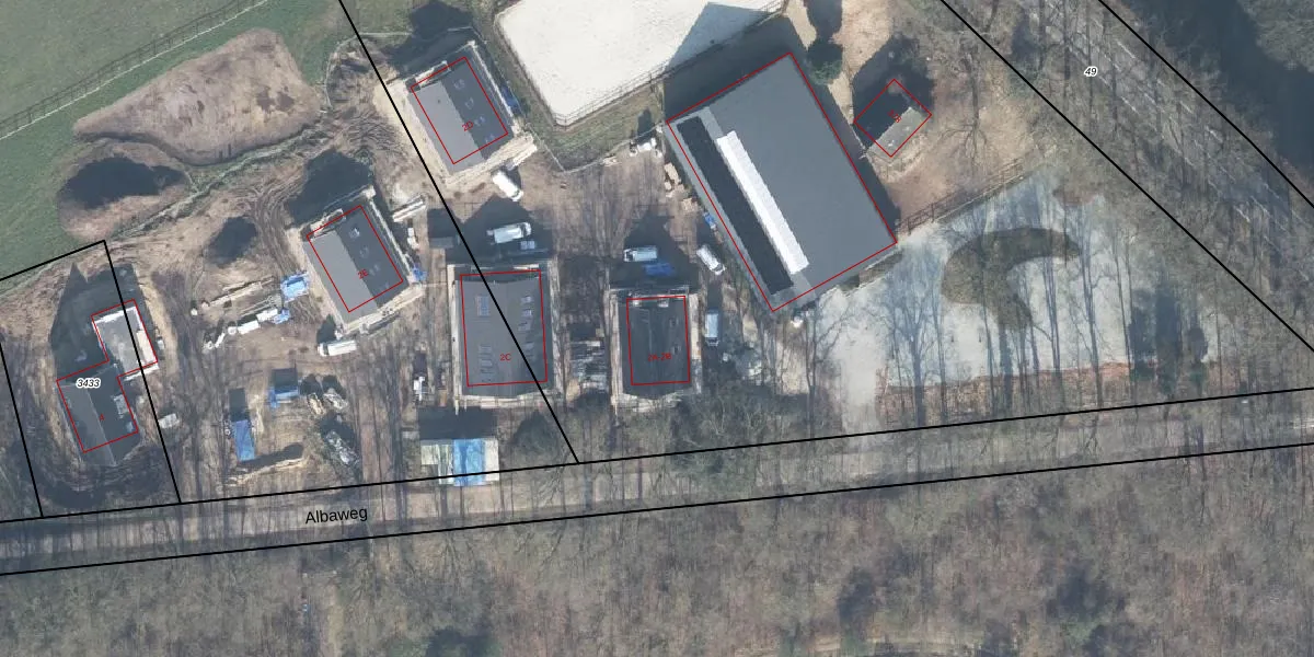 Het perceel waarop Albaweg 2-B staat heeft een oppervlakte van 1,2 ha. Dit is een zeer groot perceel. De perceeloppervlakte wordt geregistreerd door het Kadaster. Gedetailleerde informatie over de maten van dit perceel kunt u vinden in het rapport Kadastrale kaart met maatvoering van Albaweg 2-B.
