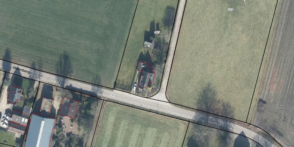 Het perceel waarop Molenberg 21 staat heeft een oppervlakte van 2930 m². Dit is een zeer groot perceel. De perceeloppervlakte wordt geregistreerd door het Kadaster. Gedetailleerde informatie over de maten van dit perceel kunt u vinden in het rapport Kadastrale kaart met maatvoering van Molenberg 21.