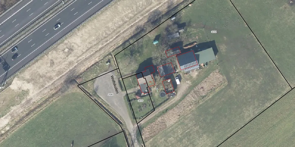Het perceel waarop Wolfskuilen 75 staat heeft een oppervlakte van 8465 m². Dit is een zeer groot perceel. De perceeloppervlakte wordt geregistreerd door het Kadaster. Gedetailleerde informatie over de maten van dit perceel kunt u vinden in het rapport Kadastrale kaart met maatvoering van Wolfskuilen 75.