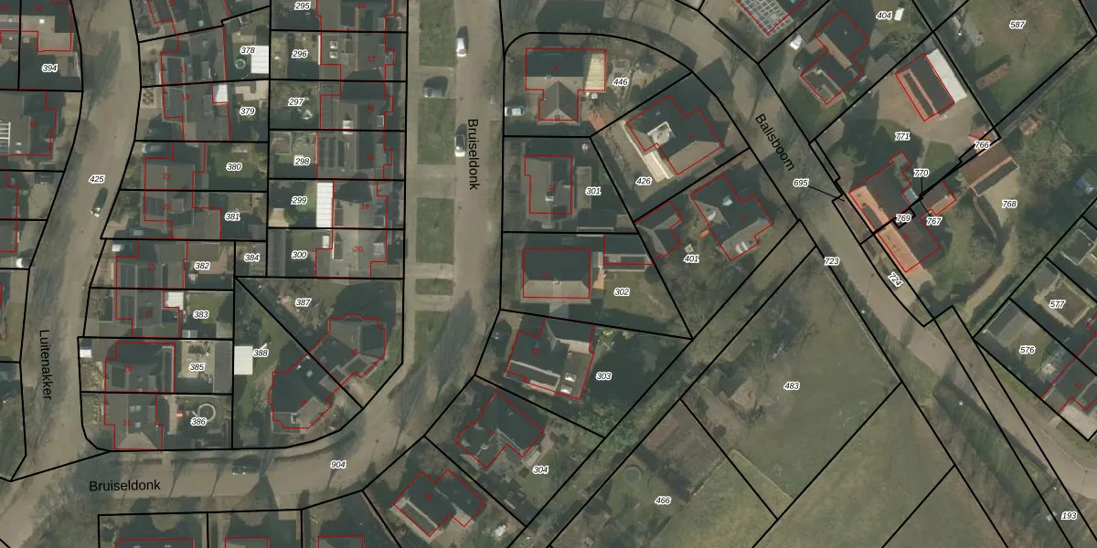 Het perceel waarop Bruiseldonk 13 staat heeft een oppervlakte van 489 m². Dit is een groot perceel. De perceeloppervlakte wordt geregistreerd door het Kadaster. Gedetailleerde informatie over de maten van dit perceel kunt u vinden in het rapport Kadastrale kaart met maatvoering van Bruiseldonk 13.
