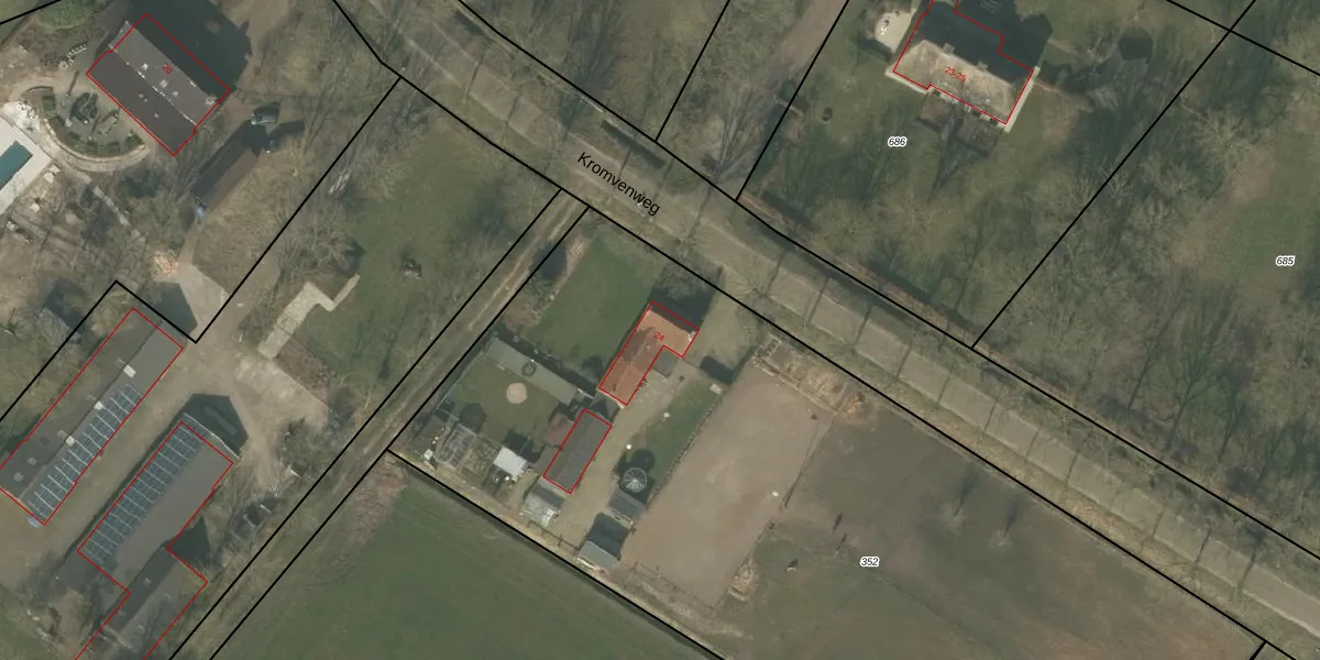 Het perceel waarop Kromvenweg 24 staat heeft een oppervlakte van 5650 m². Dit is een zeer groot perceel. De perceeloppervlakte wordt geregistreerd door het Kadaster. Gedetailleerde informatie over de maten van dit perceel kunt u vinden in het rapport Kadastrale kaart met maatvoering van Kromvenweg 24.