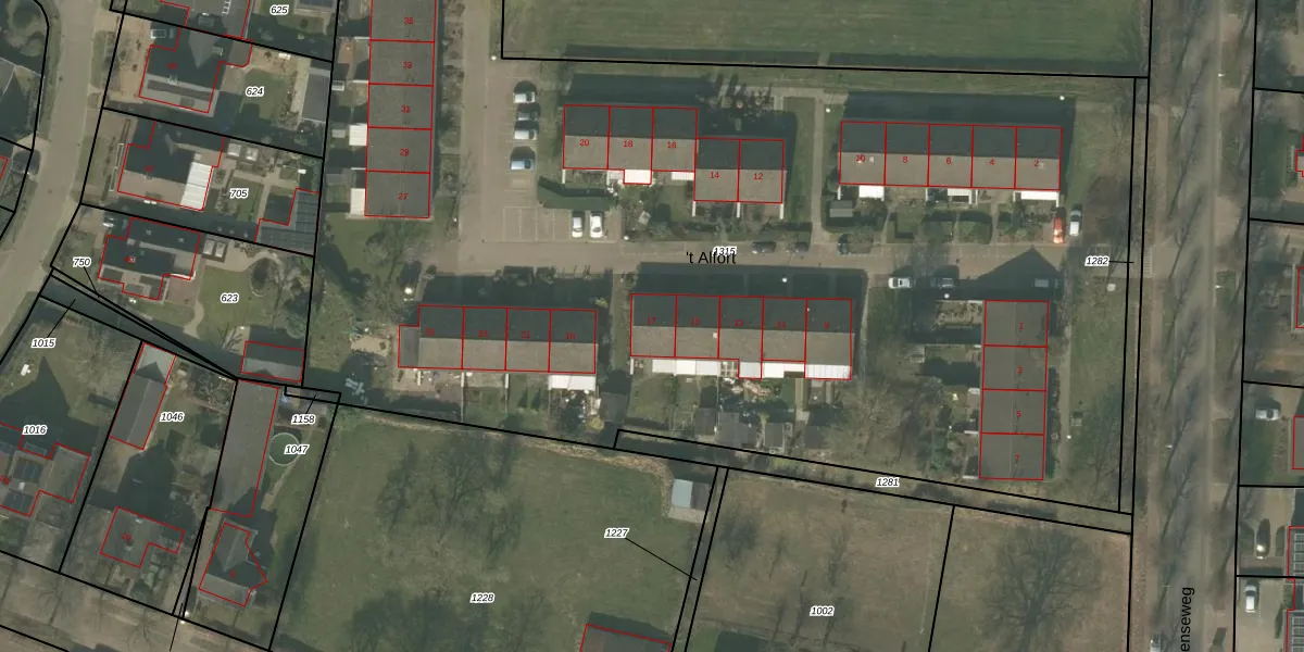 Het perceel waarop 't Alfort 17 staat heeft een oppervlakte van 7710 m². Dit is een zeer groot perceel. De perceeloppervlakte wordt geregistreerd door het Kadaster. Gedetailleerde informatie over de maten van dit perceel kunt u vinden in het rapport Kadastrale kaart met maatvoering van 't Alfort 17.