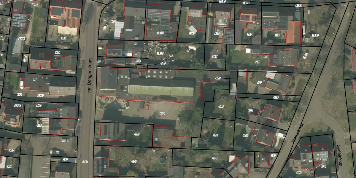 Het perceel waarop van Dongenstraat 18-e staat heeft een oppervlakte van 2405 m². Dit is een zeer groot perceel. De perceeloppervlakte wordt geregistreerd door het Kadaster. Gedetailleerde informatie over de maten van dit perceel kunt u vinden in het rapport Kadastrale kaart met maatvoering van van Dongenstraat 18-e.