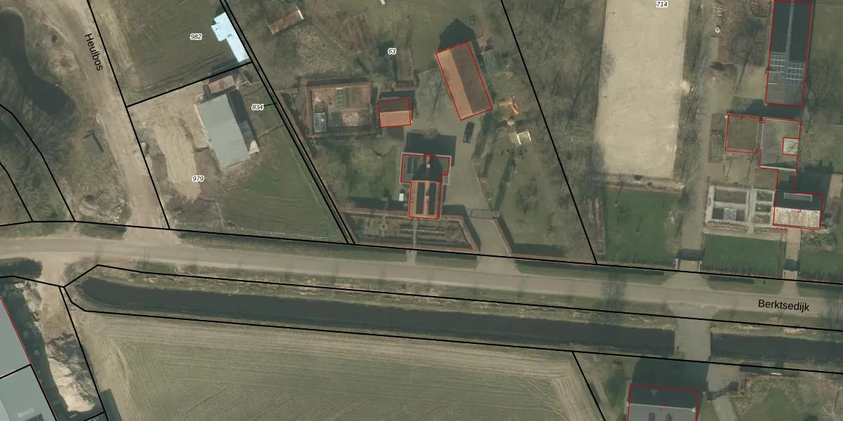 Het perceel waarop Berktsedijk 1 staat heeft een oppervlakte van 5360 m². Dit is een zeer groot perceel. De perceeloppervlakte wordt geregistreerd door het Kadaster. Gedetailleerde informatie over de maten van dit perceel kunt u vinden in het rapport Kadastrale kaart met maatvoering van Berktsedijk 1.