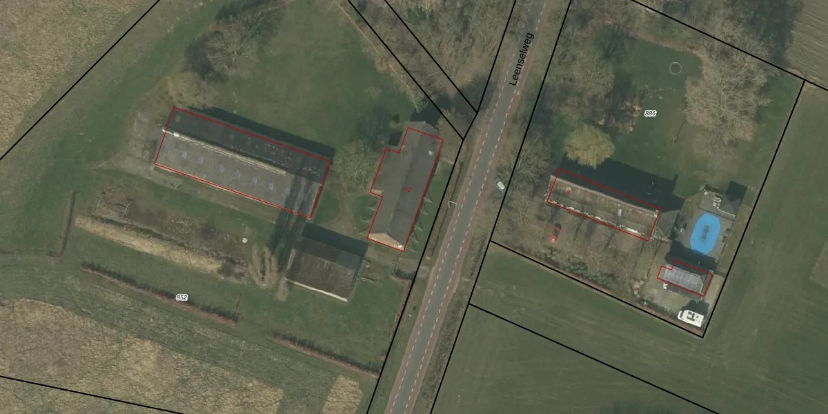 Leenselweg 10 is gelegen op kadastraal perceel DNE00R852. Deze kadastrale aanduiding is uniek en wordt gebruikt door het Kadaster om eigendomsrechten en andere zakelijke rechten vast te leggen. Het perceel maakt onderdeel uit van de kadastrale gemeente Deurne.