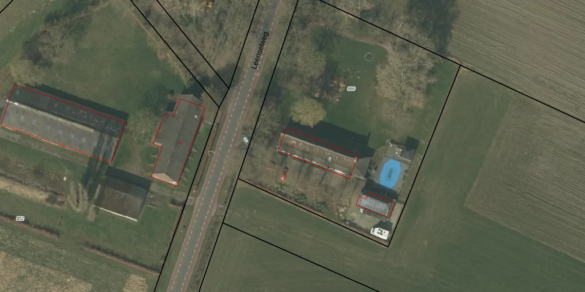 Het perceel waarop Leenselweg 9 staat heeft een oppervlakte van 3895 m². Dit is een zeer groot perceel. De perceeloppervlakte wordt geregistreerd door het Kadaster. Gedetailleerde informatie over de maten van dit perceel kunt u vinden in het rapport Kadastrale kaart met maatvoering van Leenselweg 9.