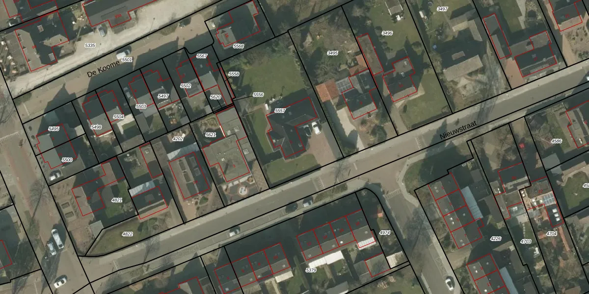 Nieuwstraat 5 is gelegen op kadastraal perceel DNE00G5557. Deze kadastrale aanduiding is uniek en wordt gebruikt door het Kadaster om eigendomsrechten en andere zakelijke rechten vast te leggen. Het perceel maakt onderdeel uit van de kadastrale gemeente Deurne.