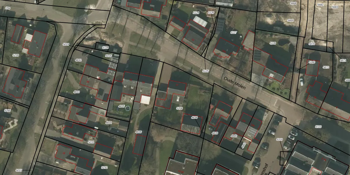 Het perceel waarop Oude Molen 17 staat heeft een oppervlakte van 1010 m². Dit is een zeer groot perceel. De perceeloppervlakte wordt geregistreerd door het Kadaster. Gedetailleerde informatie over de maten van dit perceel kunt u vinden in het rapport Kadastrale kaart met maatvoering van Oude Molen 17.