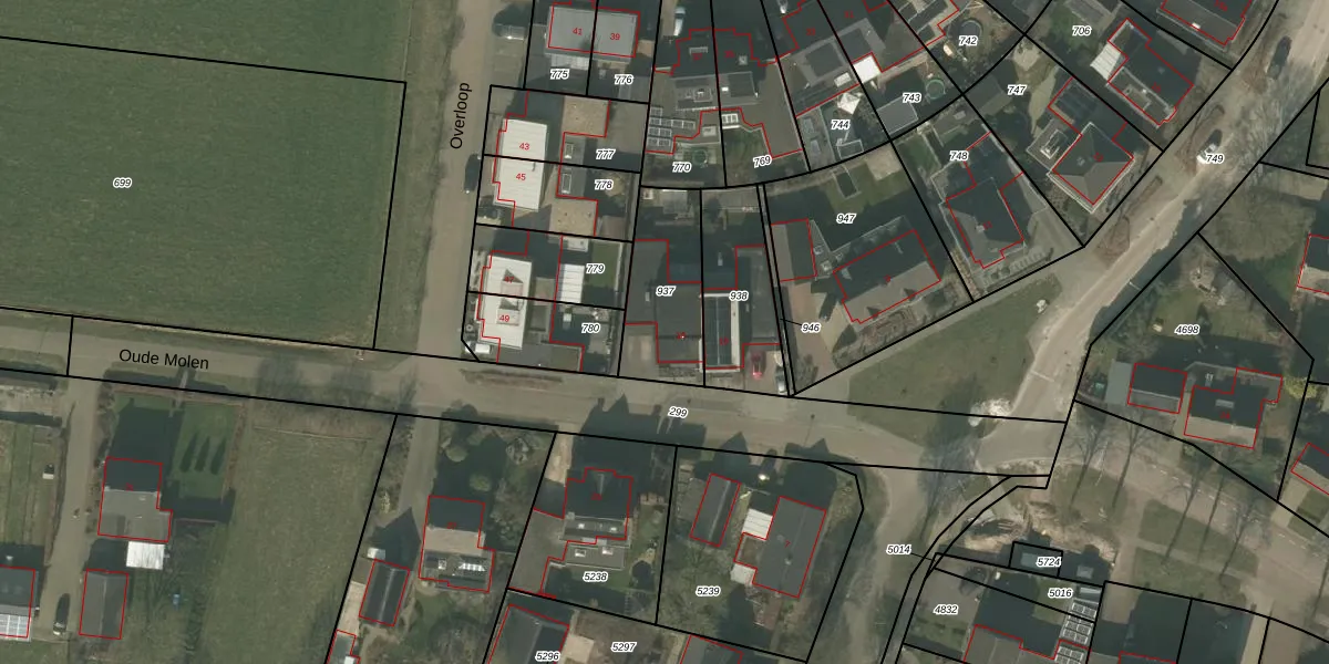 Het perceel waarop Oude Molen 18 staat heeft een oppervlakte van 327 m². Dit is een groot perceel. De perceeloppervlakte wordt geregistreerd door het Kadaster. Gedetailleerde informatie over de maten van dit perceel kunt u vinden in het rapport Kadastrale kaart met maatvoering van Oude Molen 18.