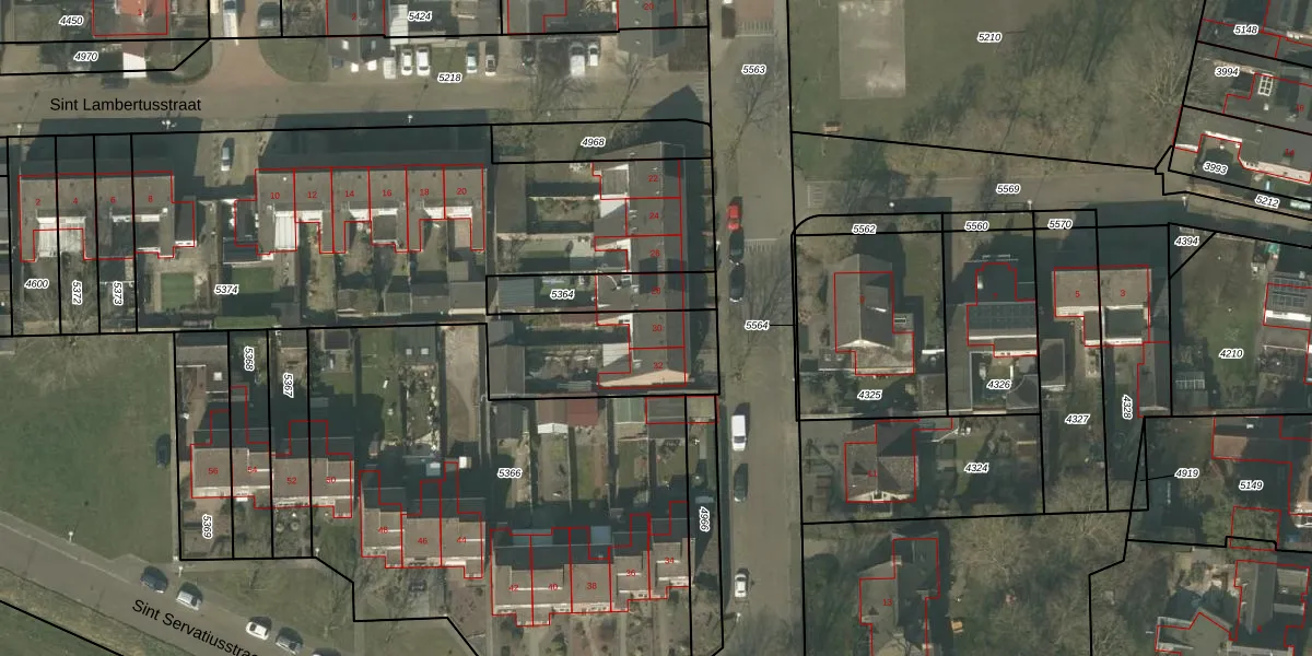 Het perceel waarop Sint Servatiusstraat 30 staat heeft een oppervlakte van 2690 m². Dit is een zeer groot perceel. De perceeloppervlakte wordt geregistreerd door het Kadaster. Gedetailleerde informatie over de maten van dit perceel kunt u vinden in het rapport Kadastrale kaart met maatvoering van Sint Servatiusstraat 30.