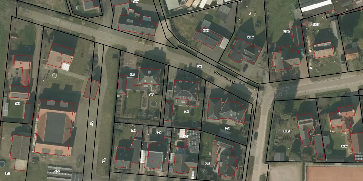 Vossenweg 9 is gelegen op kadastraal perceel DNE00R734. Deze kadastrale aanduiding is uniek en wordt gebruikt door het Kadaster om eigendomsrechten en andere zakelijke rechten vast te leggen. Het perceel maakt onderdeel uit van de kadastrale gemeente Deurne.