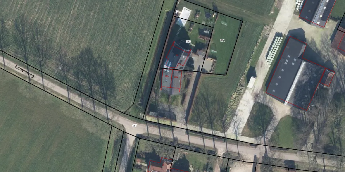 Het perceel waarop Eimersweg 10-a staat heeft een oppervlakte van 4,9 ha. Dit is een zeer groot perceel. De perceeloppervlakte wordt geregistreerd door het Kadaster. Gedetailleerde informatie over de maten van dit perceel kunt u vinden in het rapport Kadastrale kaart met maatvoering van Eimersweg 10-a.
