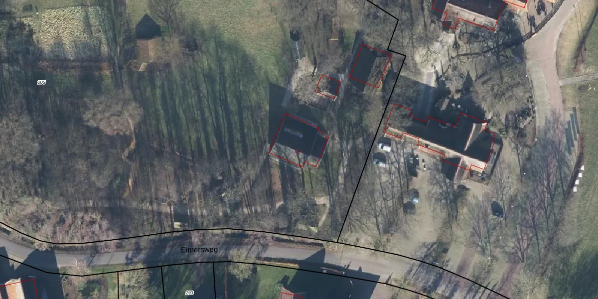 Het perceel waarop Eimersweg 4-b staat heeft een oppervlakte van 2,5 ha. Dit is een zeer groot perceel. De perceeloppervlakte wordt geregistreerd door het Kadaster. Gedetailleerde informatie over de maten van dit perceel kunt u vinden in het rapport Kadastrale kaart met maatvoering van Eimersweg 4-b.