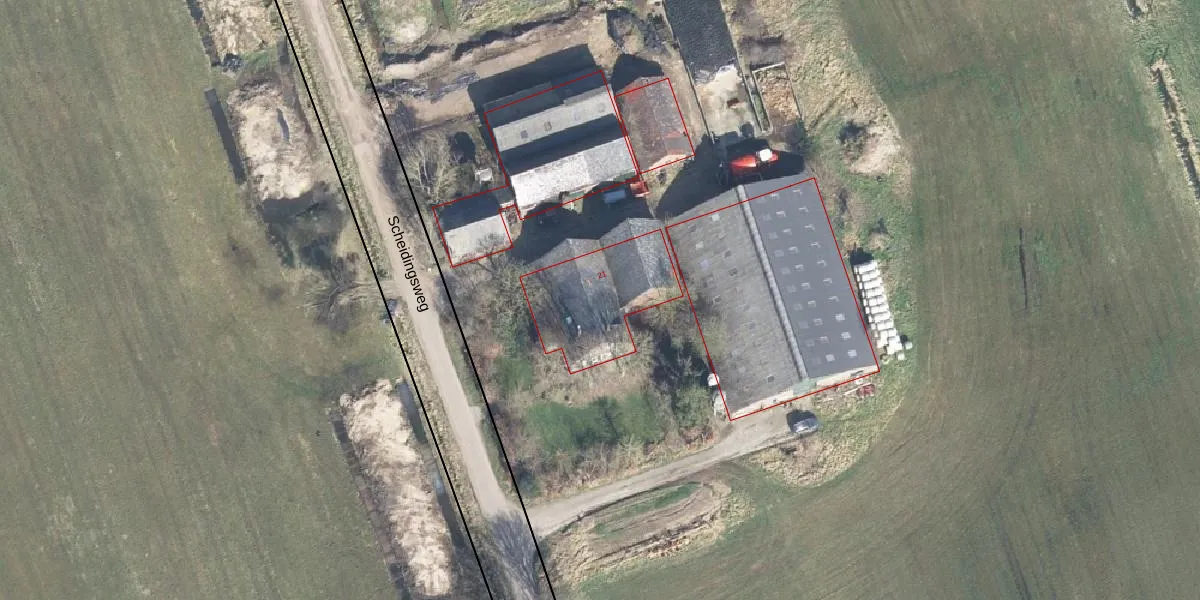 Het perceel waarop Scheidingsweg 21 staat heeft een oppervlakte van 9,5 ha. Dit is een zeer groot perceel. De perceeloppervlakte wordt geregistreerd door het Kadaster. Gedetailleerde informatie over de maten van dit perceel kunt u vinden in het rapport Kadastrale kaart met maatvoering van Scheidingsweg 21.