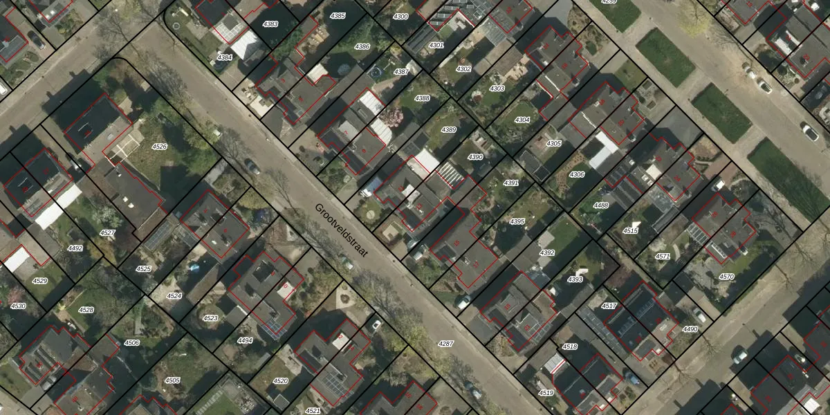 Het perceel waarop Grootveldstraat 13 staat heeft een oppervlakte van 353 m². Dit is een groot perceel. De perceeloppervlakte wordt geregistreerd door het Kadaster. Gedetailleerde informatie over de maten van dit perceel kunt u vinden in het rapport Kadastrale kaart met maatvoering van Grootveldstraat 13.